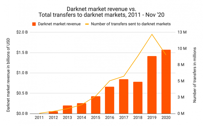 从臭名昭著的丝绸之路开始,暗网市场就一直备受关注。在 2013 年的鼎盛时期,在所有比特币活动中暗网占据了将近 20%。虽然随着时间推移它在整体加密货币活动中比例减少,但由于加密货币的蓬勃发展暗网生态系统也得到了快速的发展。