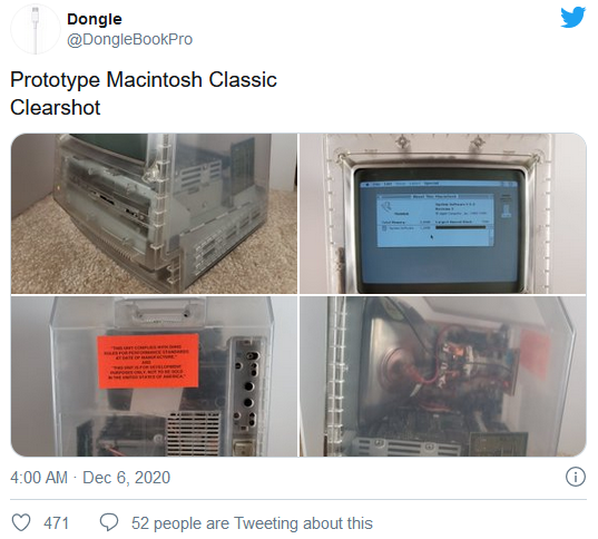 一款Macintosh Classic的原型版在Twitter上浮出水面,图片显示这款古董Mac被装在一个不同寻常的完全透明的磨砂外壳中。Macintosh Classic是我们熟悉的古董电脑,它以经典的设计以及浅米色的外壳而闻名。而在"@DongleBookPro"在Twitter上分享的图片中,苹果在开发过程中使用了不同的外壳风格。