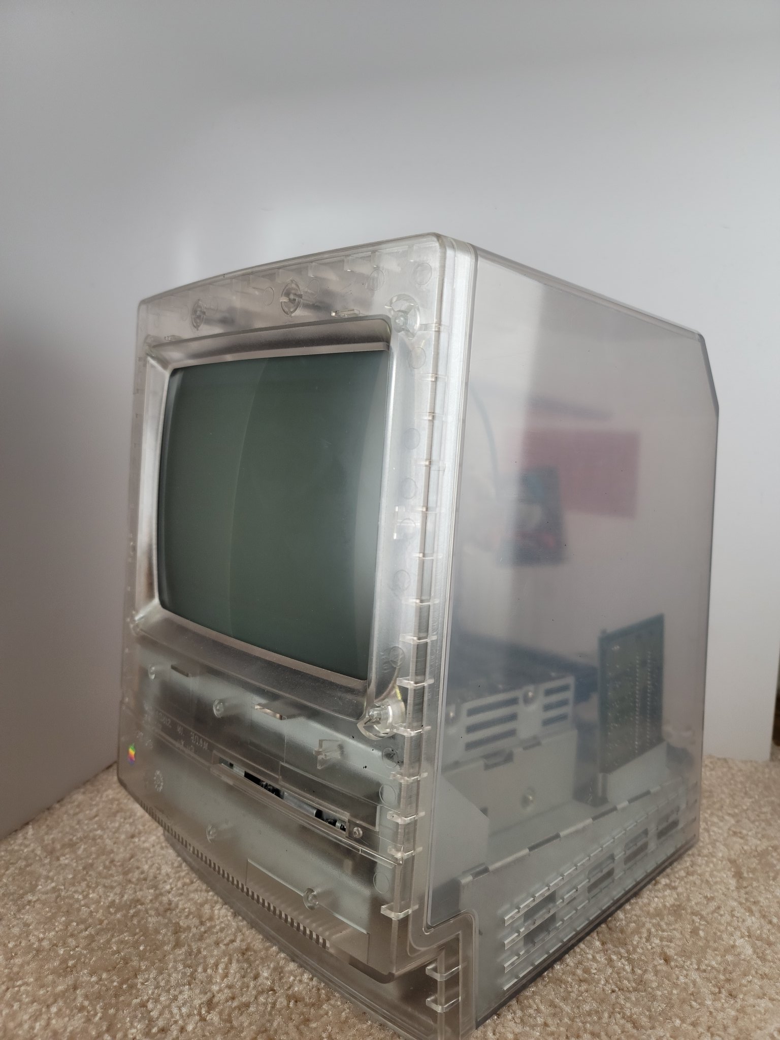 上周六发布的 "Macintosh Classic原型机"的照片显示,这台电脑被安置在一个透明的塑料外壳中。这让观察者有机会好好看看这台电脑内部的布局,大尺寸CRT屏幕占据了顶部的大量空间,而下部则放置了大部分计算元件。由于采用了全透明的外壳,内部的各种字样都足够清晰,甚至可以看到"新加坡制造"的文字。机身正面,彩虹色的苹果logo格外醒目。