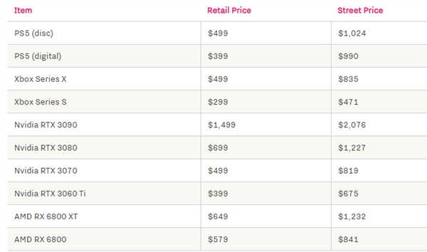 以下是Hollister平均了100多件转售商品后整理的市场均价,主机、显卡等仍旧都在夸张加价。