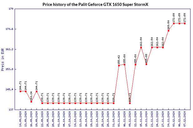 从他们的数据来看,GTX 1650显卡从原来的140+欧元一路涨到了150+、160+甚至现在的170+欧元。