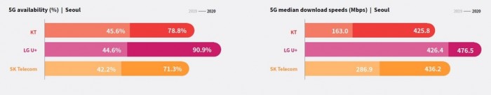 RootMetrics的数据显示,LG Uplus去年的5G下载速度中值为426.4 Mbps,SK电讯为286.9Mbps,KT为163Mbps。当时,KT以45.6%的5G可用性领先,随后为LG Uplus(44.6%)和SK电讯(42.2%)。