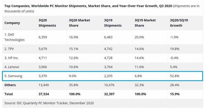 日前,IDC发布了今年三季度全球PC显示器市场的统计报告。数据显示,戴尔三季度出货635.9万台显示器,份额16.9%列第1,2~5名分别是TPV、惠普、联想和三星。同比来看的话,戴尔、惠普的出货均略有下滑,其它三家则实现增长,其中三星的增幅最为夸张,达到了52.8%,三星的傲人成绩据说与其面向生产力和游戏的显示器新品表现出色有关。
