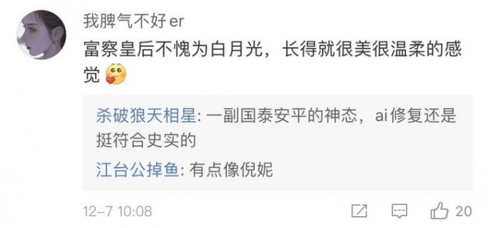 有网友表示,AI修复后的富察皇后很美很温柔,有点像倪妮,你觉得呢?