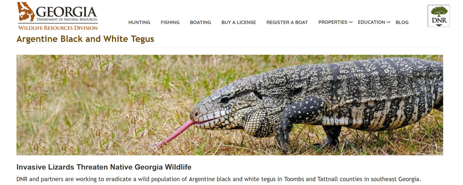 乔治亚州自然资源部野生动物资源部门针对这一情况发布了一份警告。该警告解释了这种爬行动物对当地野生动物构成的风险,除了会吃掉当地的野生动物及它们的蛋,这种蜥蜴还会把它们无力抵抗的疾病传播给当地的动物。