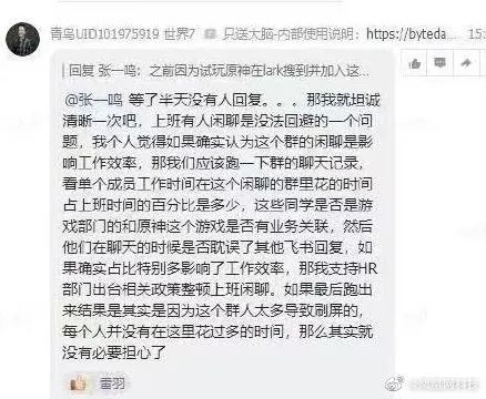 网传聊天记录截图显示,他表示“之前因为试玩原神,在lark(飞书)搜到并加入了这个群。最近我发现这个群在上班时间一直拼命在闪,所以这两天我留心了下,发现有一些同学经常在上班时间非常专注地聊游戏。”