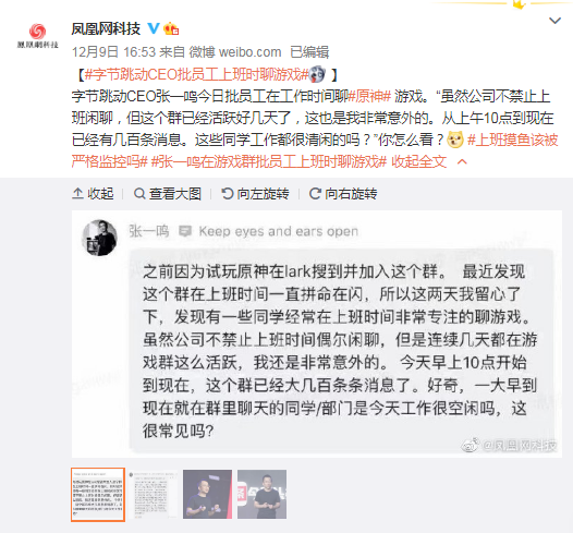 张一鸣进一步指出“虽然公司不禁止上班时间偶尔闲聊,但是连续几天都在游戏群这么活跃,我还是非常意外的。”