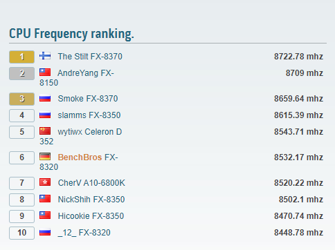 当然,在CPU频率排行榜上,人类创造的最高纪录还是AMD的推土机架构CPU,FX-8370最高实现了8722.78MHz的成绩。