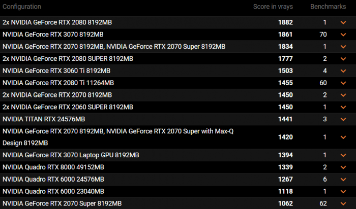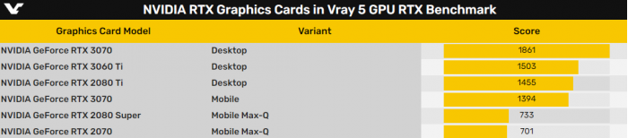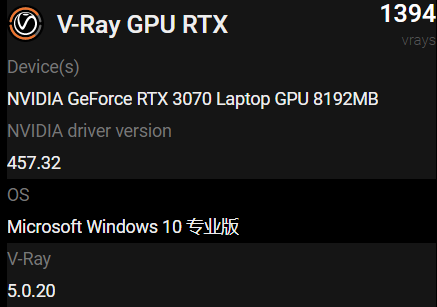 下个月初,笔记本尤其是游戏本将迎来一场盛宴:不出意外的话,AMD会带来Zen3架构的锐龙5000U、锐龙5000H系列,Intel会发布10nm工艺的11代酷睿H系列,NVIDIA则会奉上安培架构的RTX 30系列。今天,光追基准测试库V-Ray 5网站上首次出现了RTX 30系列移动版的跑分,来自次旗舰RTX 3070,成绩为1394。