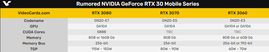 比如移动版RTX 3080,预计就只有5888个流处理器、256-bit 8/16GB GDDR6,只相当于桌面的RTX 3070,而移动版的RTX 3070具体规格暂时不详,估计只有和桌面版RTX 3060 Ti差不多的水平。