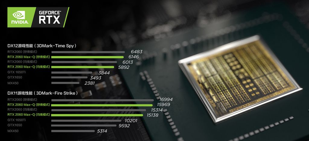 同样满血的还有英伟达RTX2060 Max-Q显卡,这款显卡可以算是笔记本电脑上的最强显卡之一了,拥有1920个流处理器以及6GB 192bit GDDR6显存,支持光追技术,性能强大。而且它也可以在野兽模式下开启最高达75W的功耗,官方测试在3DMark-Time Spy下,它的分数最高可达6146。
