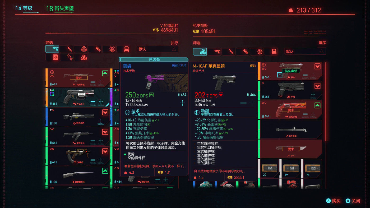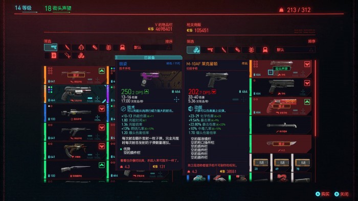 单论在FPS射击这一核心体验上,《赛博朋克2077》采取稳扎稳打的设计。玩家可以像寻常FPS游戏那样,运用各色枪械与敌人灵活对枪的同时,借助环境掩体闪转挪腾,期间还能穿插各种主动、被动的子弹时间技能。整体射击手感虽不及专业FPS打枪大佬那般细腻,却也有着相当不错的反馈。这之外,分派别的技能养成与针对性的义体配件则呈现了额外的选择。