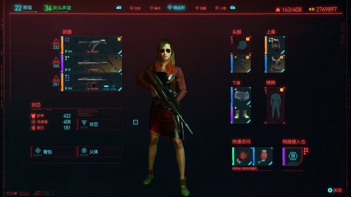 在核心战斗系统的设计上,《赛博朋克2077》以第一人称射击为基底,结合近身肉搏、黑客潜行、赛博义体养成打造了一套可远可近,可潜行可正面的战斗组合拳。