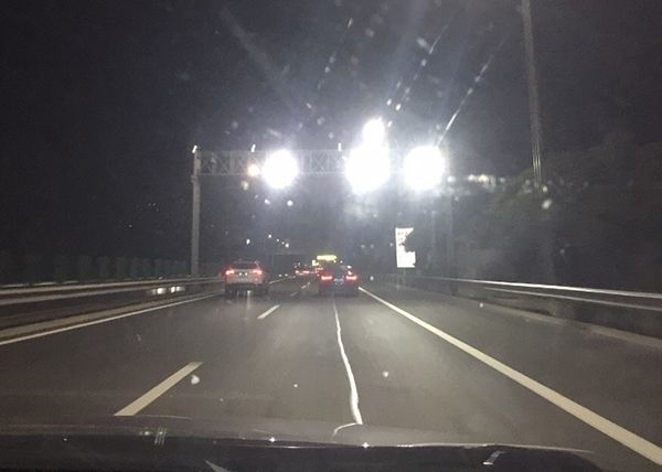 视频拍摄者称:“我建议取消高速龙门架上的射灯,每次通过的时候照的你什么都看不见,非常的危险。”