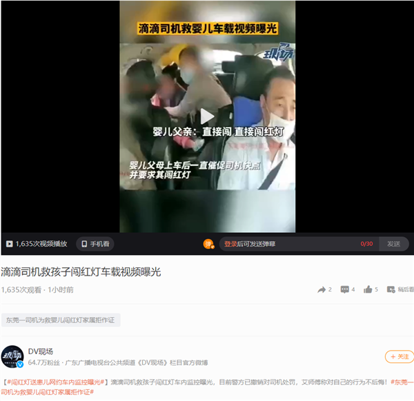 由于滴滴网约车上都会有录音及录像证据,此事之后网上也曝光了艾先生接单患儿家属的视频,画面显示婴儿父母上车之后一直催促司机快点,并要求闯红灯,期间婴儿还出现了口吐白沫的情况,孩子母亲不断恳求司机快点快点。