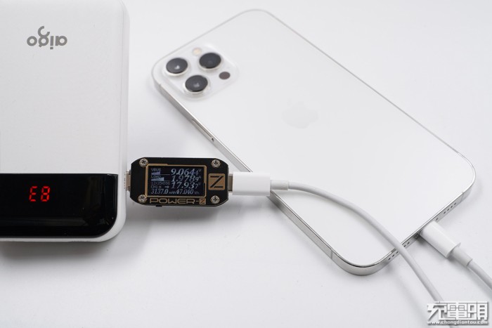 使用OPSO欧普索PP001 18W PD充电宝为iPhone 12 Pro Max充电,电压9.08V,电流1.91A,功率17.36W。