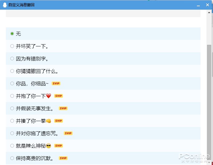没想到吧,新版 QQ 还能让你在撤回消息那里搞搞新意思。用户可通过:设置→会话窗口 →设置撤回消息,来设置个性化的撤回消息提示,设置后当你撤回消息时,对方看到的就不再是呆板的 “撤回了一条消息”,而是 “有错别字”、“你猜猜撤回了啥”。不过目前只能使用内置的几条自定义撤回消息,无法自行设置自定义消息,而其中的大部分也仅限会员使用。