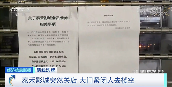 据央视报道,近日,全国多地消费者发现,自己在泰禾影城买的电影票已经无法使用了,随后,北京、西安、长沙等地多家泰禾影城也陆续曝出关店的消息。北京市丰台区一家泰禾影城门口,张贴的公告显示,这家电影院于11月28日突然宣布停业了。 商场工作人员表示,什么消息都没有。看他往外搬设备了,被拦住了,他们才贴了停业通知。