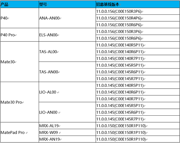手机:全网通(5G双卡)P40 、 全网通版P40 Pro、Mate30、Mate30(5G) 、Mate30 Pro、Mate30 Pro(5G),型号清单为ANA-AN00、ELS-AN00、TAS-AL00、TAS-AN00、LIO-AL00、LIO-AN00 。