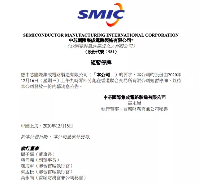 雷锋网了解到,12 月 16 日上午,因为人事变动,中芯国际已经宣布在香港暂停股票交易。