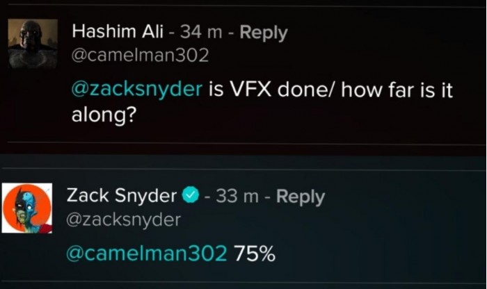 粉丝Hashim Ali问扎导:(导演剪辑版《正义联盟》)的特效制作完成了吗?现在做了多少?扎导非常爽快地回答道:75%。由于扎导的导演剪辑版《正义联盟》的独特性质,它的后期制作与典型的好莱坞大片不同,典型的好莱坞电影往往在开拍之前就有上映日期。