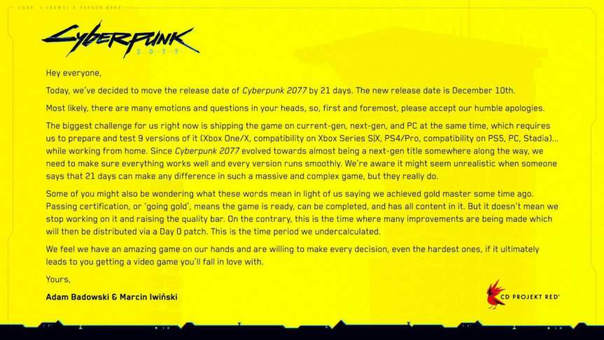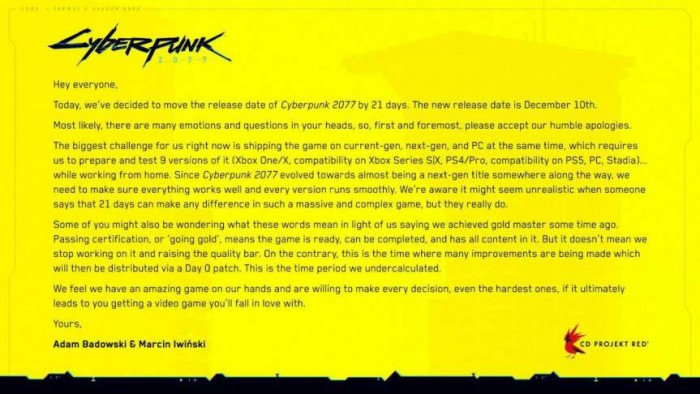 再往前追溯到10月28日,CDPR宣布《赛博朋克2077》跳票的“黄图”公告刷爆网络,引发了大量围观群众争相玩黄图梗。而CDPR给出的延期理由,则是为了完善次世代版游戏实机表现。CDPR自然深知《赛博朋克2077》的真实品质,但漫长的开发周期,已经让它没法再拖下去了。