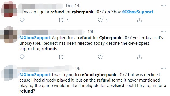 微软那边的情况类似,玩家在申请Xbox One数字版《赛博朋克2077》退款的时候,同样遭到了拒绝。
