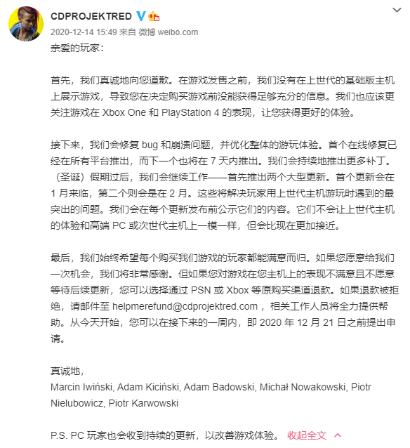 2020年11月29日,同样是在电话会议上,CDPR总裁兼联合首席执行官Adam Kicinski信誓旦旦地表示,《赛博朋克2077》在PS4、Xbox One上的表现出奇地好。
