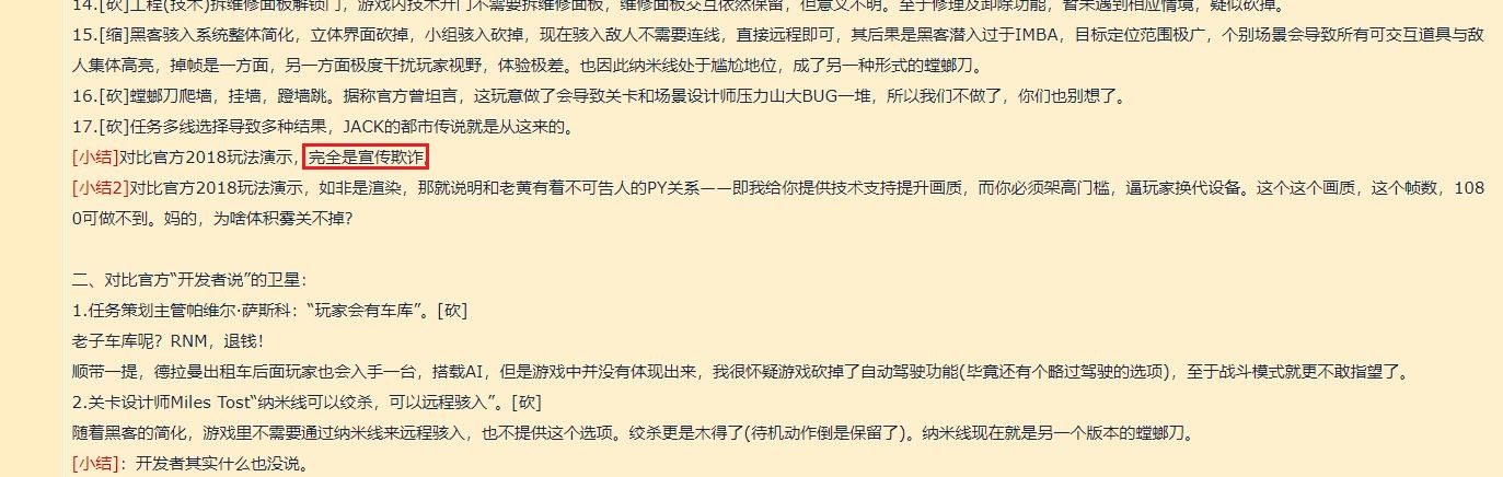 而另一篇“《赛博朋克2077》到底砍掉了哪些内容?”的帖子,网友们总结的疑似被砍的内容超过了20处。帖子中更是辛辣地指出,对比官方2018年发布的玩法演示,这已经涉嫌宣传欺诈。