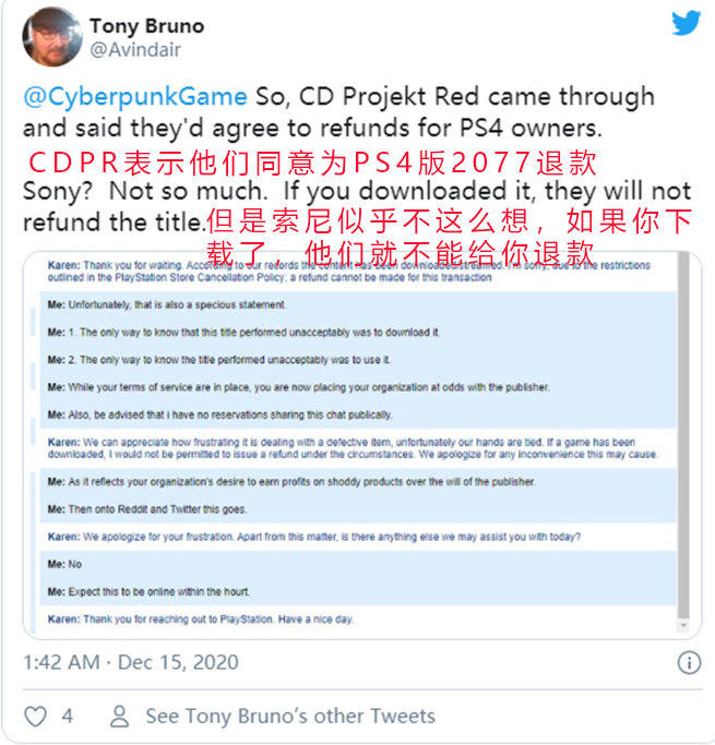 提前感受一下赛博朋克时代对普通人的残忍,未尝不是一件好事。而CDPR专门为购买了PS4、Xbox One版数字游戏的玩家开设退款服务,倒是暗合了《赛博朋克2077》所带有的几分“反赛博朋克”的腔调。只可惜理想属于“波兰蠢驴”,现实是索尼拒绝进行配合,不会为玩家提供退款服务。按照索尼官方的服务条款,的确没有理由单独为《赛博朋克2077》开天窗。
