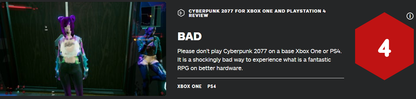 IGN也毫不留情,直接为PS4、Xbox One版《赛博朋克2077》打出了4分的极低评分。配合官方所展示的游击实机截图来看,4分不冤。而IGN为PC版《赛博朋克2077》打出的分数,高达9分。