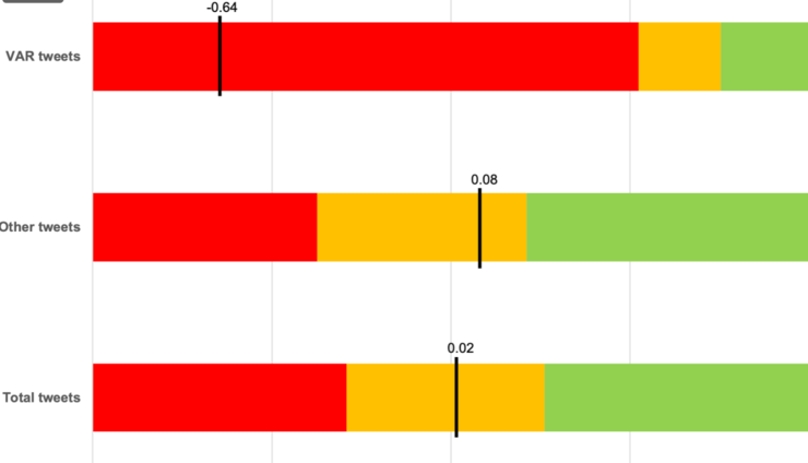 在4,583条推文中,有31.1%被标记为与视频助理裁判(VAR)相关。在情感方面,有25.5%的人表示为积极情绪,而有41.1%的人表示为负面情绪,其余为中立情绪。