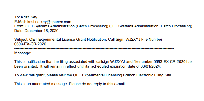 FCC周二已经批准该请求,周三给SpaceX的代表发了一封通知邮件。 这是由于SpaceX需要在其测试物品飞行时与其进行通信。这种通信是双向的,下行链路使该公司能够在原型机飞行时监测其性能,上行链路使其能够根据收到的数据改变参数。