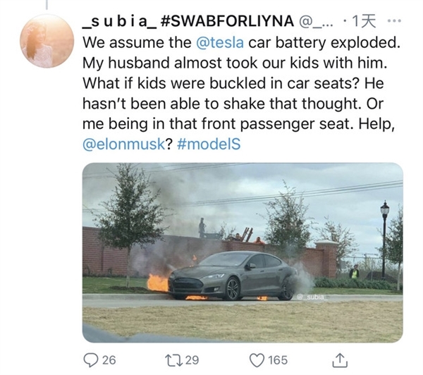 截至目前,关于这辆特斯拉Model S的起火原因,还没有给出确切的结论。不过苏比亚表示,她和丈夫一致认为,是“电池爆炸”导致的车辆起火。但特斯拉没有给出任何答复。