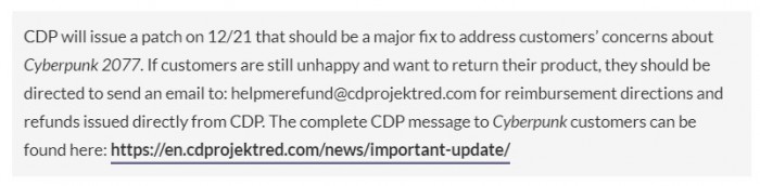 CDPR将在12月21日给《赛博朋克2077》推出一个补丁,这应该是解决玩家对《赛博朋克2077》的担忧的主要修补程序。如果玩家们仍然不满意并且想退货,则请指示他们发送电子邮件至:[email protected], 以获取直接由CDPR发出的退款指示和退款。 可以在以下网址找到发送给《赛博朋克2077》玩家完整的CDPR消息 :https: //en.cdprojektred.com/news/important-update/