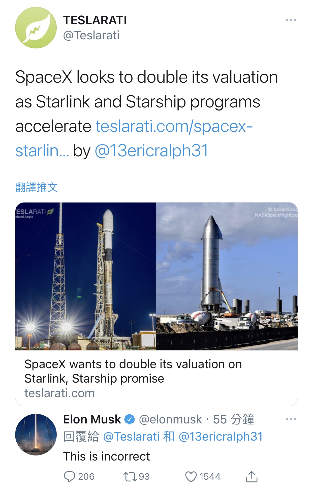 北京时间12月17日消息,马斯克在推特上表示关于SpaceX估值的报道失实。此前有外媒报道称,SpaceX正在与投资者讨论新一轮融资,并寻求将其估值提高一倍至高达920亿美元。