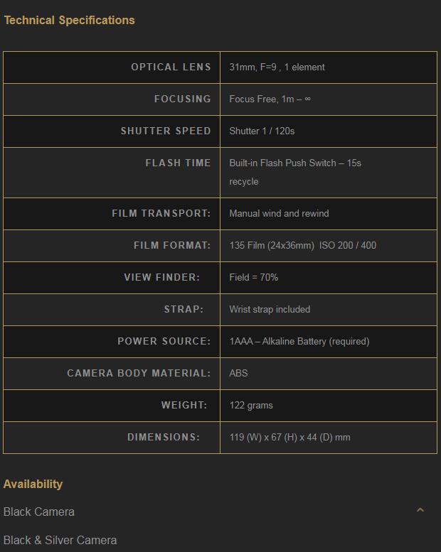 参数方面,Sprite 35-II 具有 1/120s 的固定快门速度、31mm / F9 单片式镜头,并且内置了闪光灯。