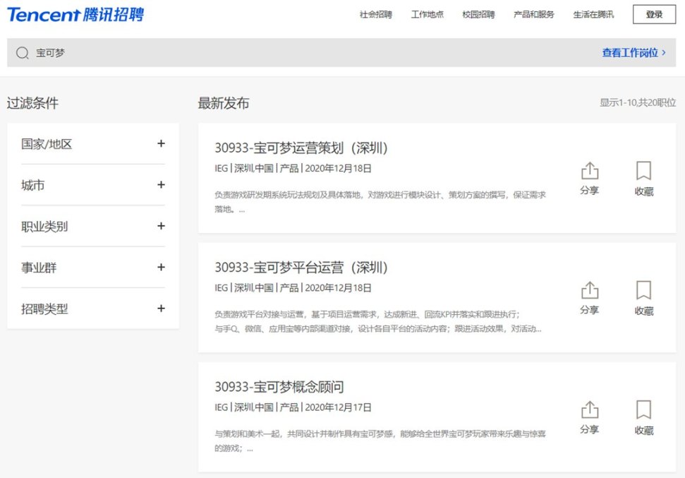 以“宝可梦”为关键词,可以在腾讯招聘页面搜到19个岗位,具体如下:
