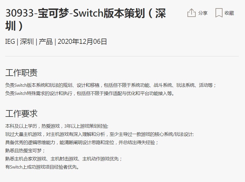 “宝可梦Switch版本策划”则要求对主机游戏有深入理解和分析,至少主导过一款游戏的核心系统/玩法设计。具备优秀的逻辑思维能力,有Switch上成功游戏项目经验者优先等等。