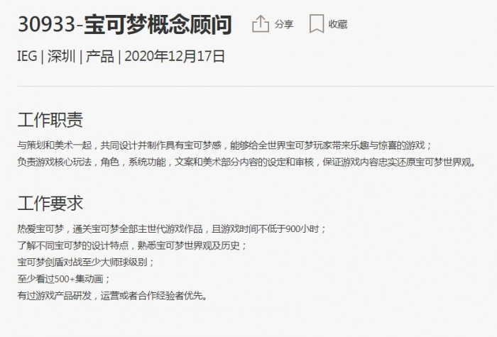 这批岗位的岗位详情中,多数都要求求职者了解宝可梦IP或熟悉宝可梦IP,技术系岗位如服务器开发工程师等也要求了解且喜欢宝可梦,并且深度熟悉且热爱宝可梦者优先。比如“宝可梦概念顾问”这一岗位的要求是通关全部主世代作品,至少看过500集动画等等。