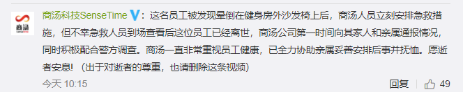 12月19日,@商汤科技SenseTime 官微在网曝视频下方回应称,这名员工被发现晕倒在健身房外沙发椅上后,商汤人员立刻安排急救措施,但不幸急救人员到场查看后这位员工已经离世,商汤公司第一时间向其家人和亲属通报情况,同时积极配合警方调查。商汤一直非常重视员工健康,已全力协助亲属妥善安排后事并抚恤。愿逝者安息!