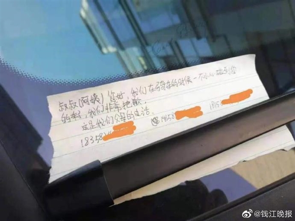 纸条上写道:“叔叔(阿姨)您好,我们在骑车的时候不小心碰到你的车,我们非常抱歉,这是我们父母的电话......”