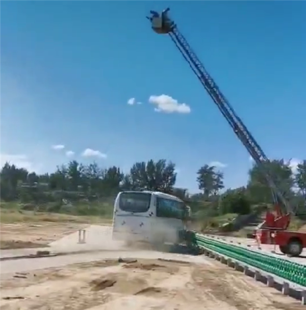 在实测实验中,大客车以高速撞击护栏,在转子的作用下,大客车的冲击力,被转化成客车与转子护栏的滚动摩擦,使大客车依靠着转子护栏,继续往前方运动,避免车辆侧翻或翻出护栏之外。