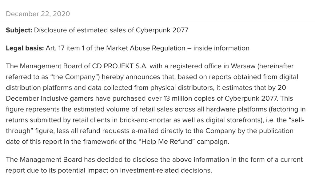 根据开发商 CD Projekt Red 母公司分享的信息,《赛博朋克2077》推出两周以来全球销量已经超过 1300 万份(12月10-20日)。在本周二发送给投资者的一份备忘录中,CD Projekt S.A.透露了这一销量里程碑。如果考虑到一些因游戏发售混乱而导致的数字/实体退款,这是一个非常了不起的里程碑。