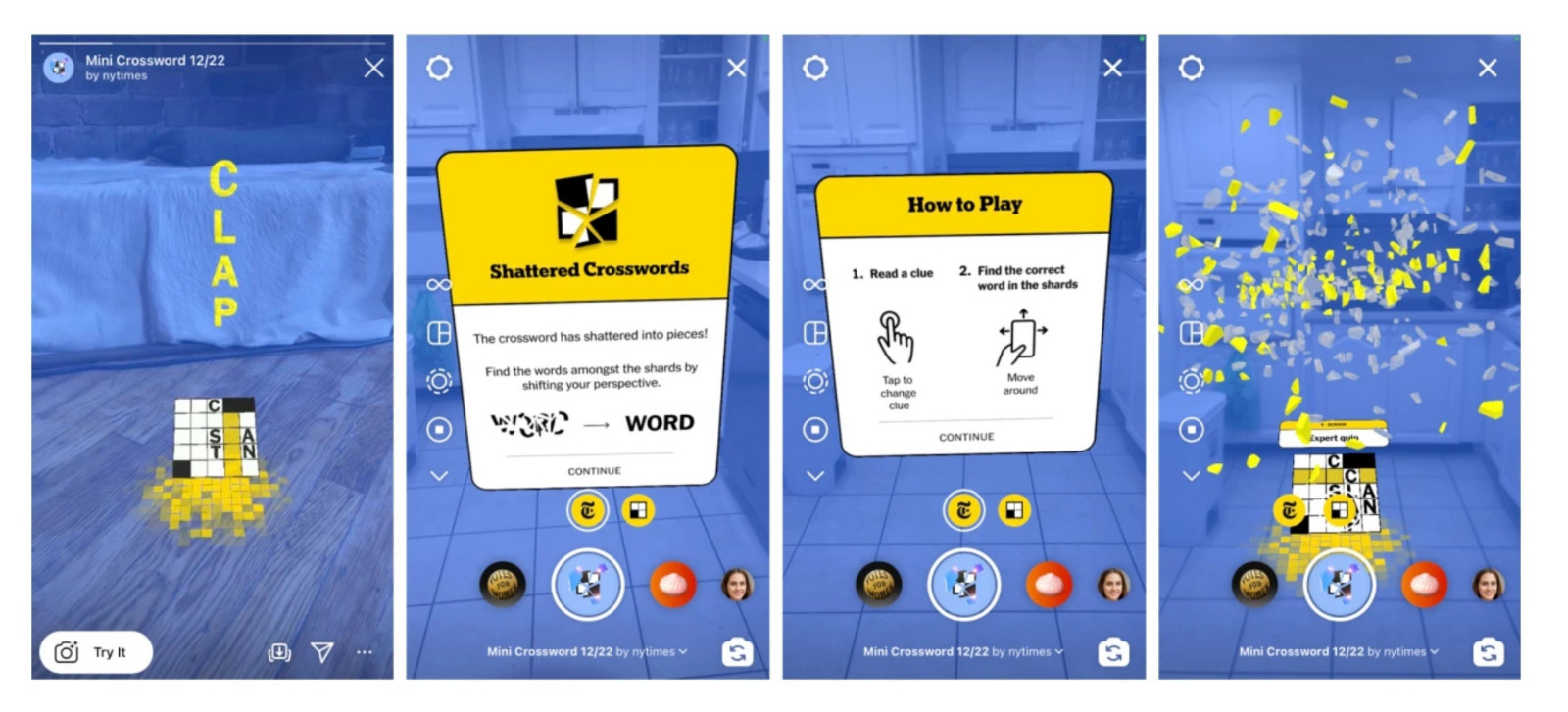 《Shattered Crosswords》现可以在@NYTimes Instagram页面的“效果(Effects)”选项卡下找到,其可以在iOS和Android平台上运行。