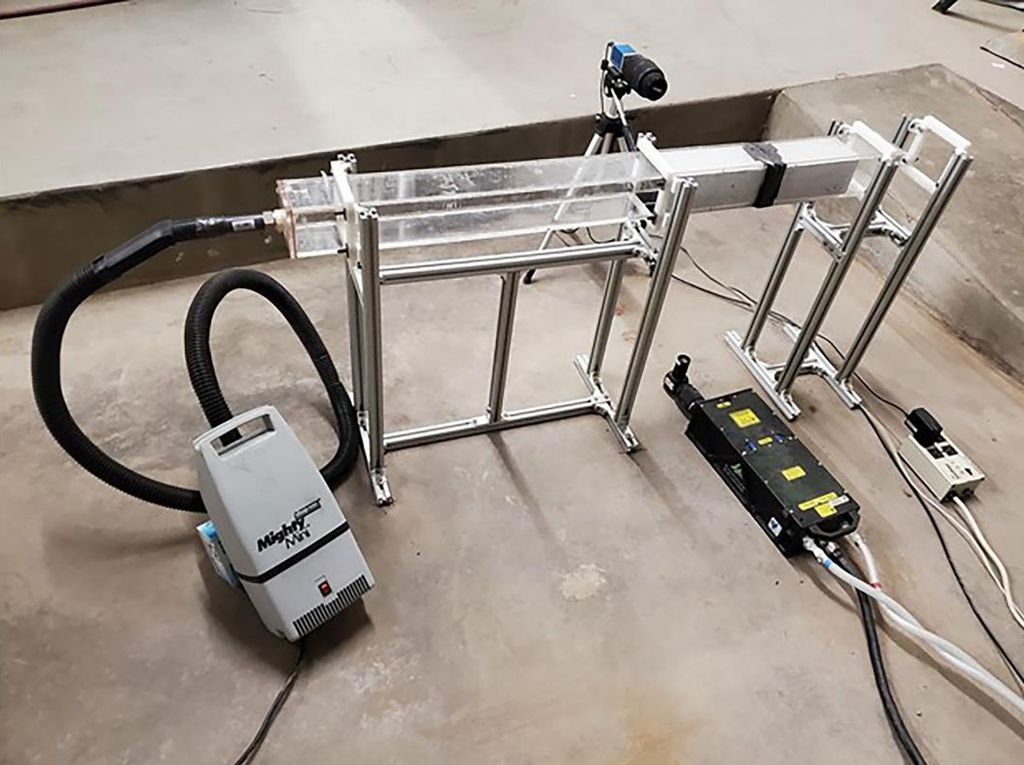 在测试中,研究人员创建了一台设备,使用空气发生器来模仿人类的咳嗽和喷嚏。该发生器用于将微小的液体颗粒,如打喷嚏和咳嗽的空气液滴,通过激光片吹到一个带有摄像头的密闭方管中。