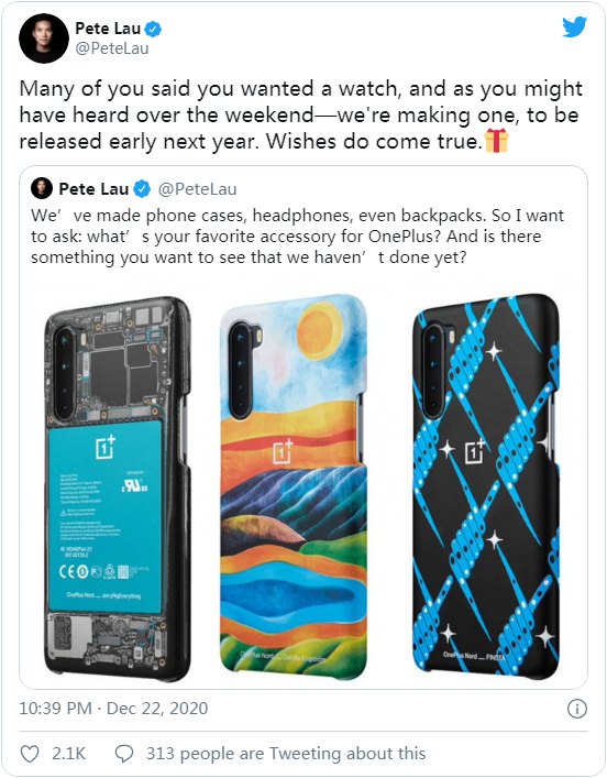 在智能手机市场积累了丰富的经验之后,一加已开始积极拓展新的产品线,比如可穿戴设备。近日,一加 CEO 刘作虎在 Twitter 上证实,该公司确实在打造一款传说中的智能手表,并且有望在 2021 上半年到来。至于该产品的确切规格、运行的系统、售价和上市日期等细节,目前暂不得而知。