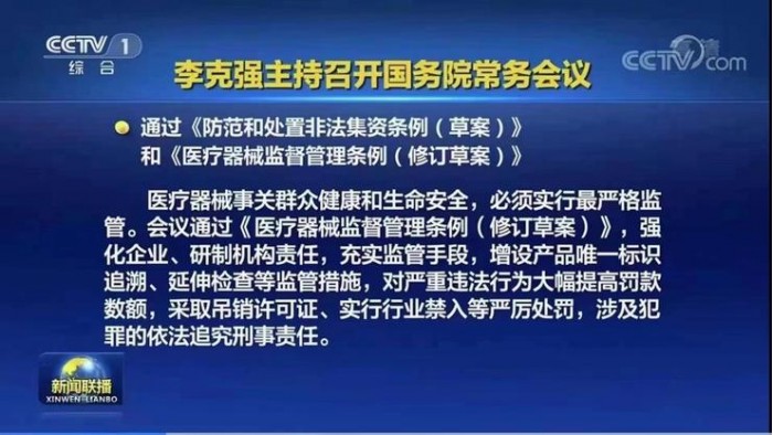 12月22日,国务院常务会议通过《防范和处置非法集资条例(草案)》和《医疗器械监督管理条例(修订草案)》。据中国政府网消息,会议指出,医疗器械事关人民群众身体健康和生命安全,必须实行最严格的监管。