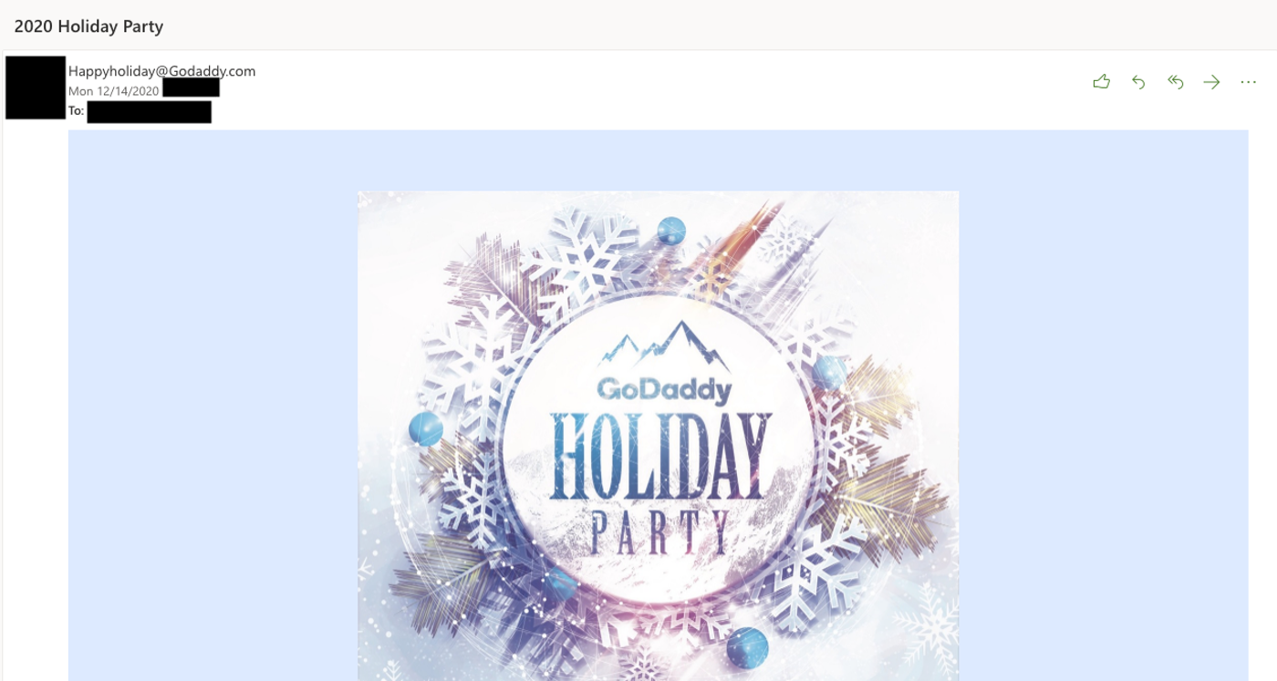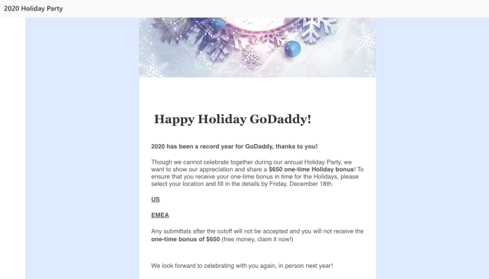 据外媒报道,日前,GoDaddy对其员工进行了一个钓鱼邮件测试,结果约有500名员工没有通过。据悉,测试中的邮件声称他们将获得650美元的假期奖金。这封邮件是由[email protected]发送,包裹在一片闪闪发光的雪花banner下,上面则印着GoDaddy Holiday Party的字样。