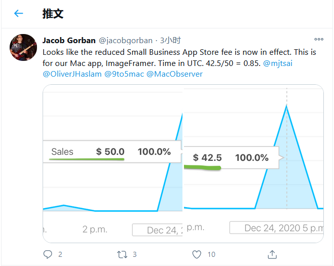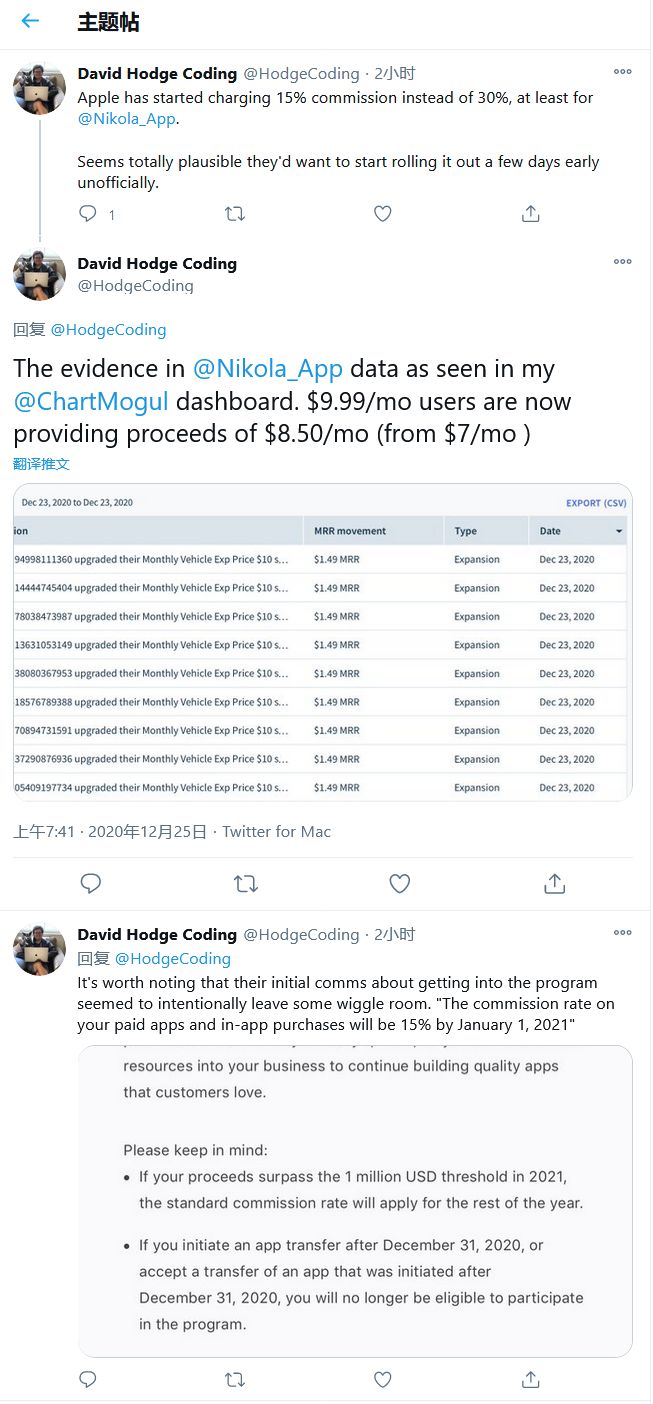 包括第三方特斯拉应用程序 Nikola 的开发者 David Hodge、照片编辑应用程序 ImageFramer 的 Mac 开发者Jacob Gorban 在内,已经有不少开发者看到佣金从原先的 30% 下调至 15%。